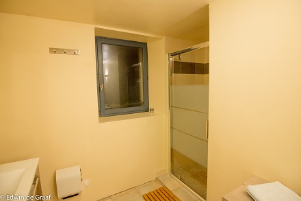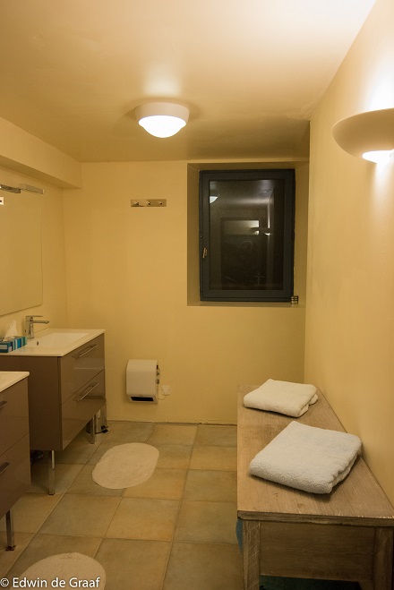 De kamers Figeac en Gourdon hebben een gezamenlijke ruime badkamer met douche en een dubbele wastafel en een apart toilet